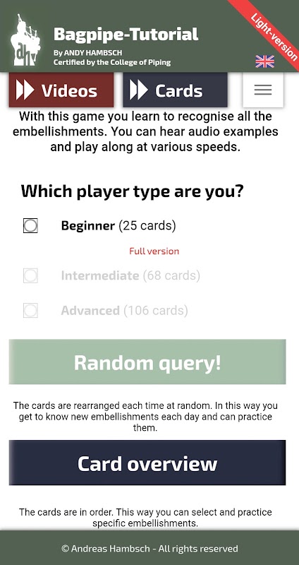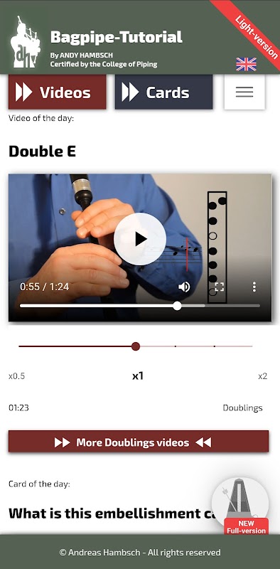 This Bagpipe-Tutorial-App by Andreas Hambsch is a milestone in the teaching of the Scottish bagpipes. Easily understandable and thorough, it is a worthwhile investment for anyone interested in piping. The Bagpipe Tutorial book, also by Andreas Hambsch, is an ideal supplement.