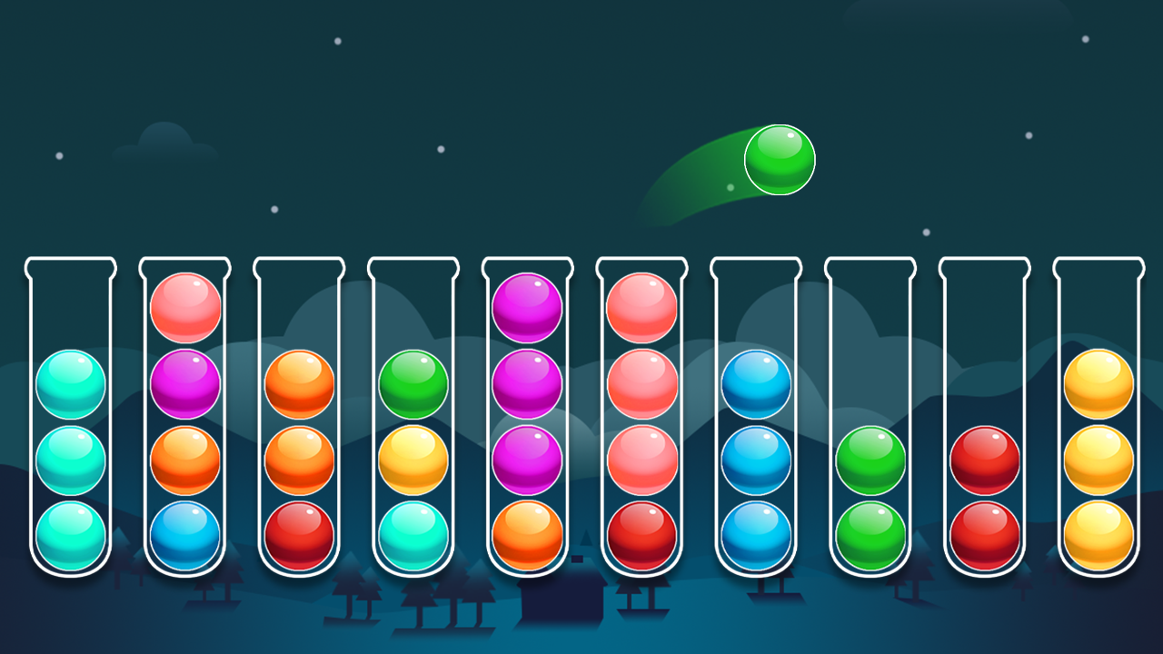 - Fill each tube with same color balls to complete level.