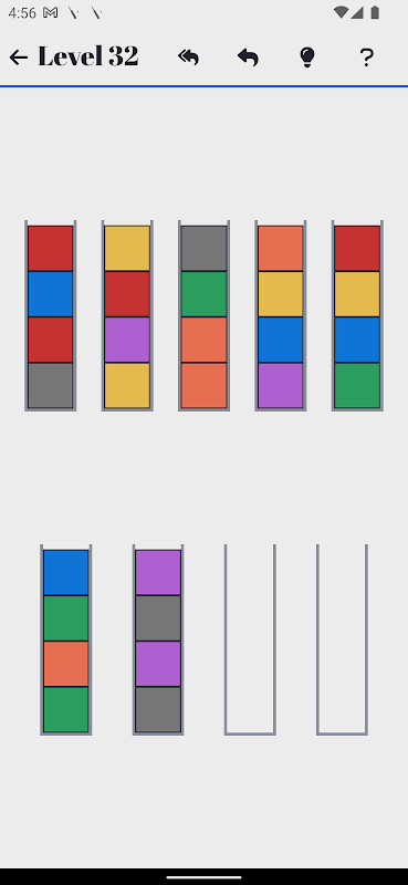 The puzzle is complete when all the balls are sorted by colour. E.g. All the red balls are in the same tube, all the blue balls are in the same tube etc.