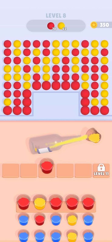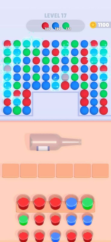 When three buckets of the same color are accumulated in the staging area, a bottle is filled and sent rolling upwards. If the bottle’s color matches the first row of balloons, it bursts, popping the balloons and earning points. If the colors don’t match, the bottle breaks empty, and no balloons are popped.