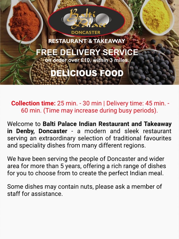 Balti Palace Indian Restaurant and Takeaway in Denby, Doncaster is a modern and sleek restaurant serving an extraordinary selection of traditional favourites and speciality dishes from many different regions.