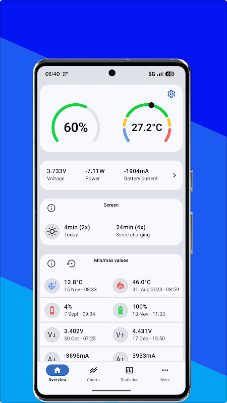 The app collects and visualizes different data about your battery and the charging process, showing statistics and charts.