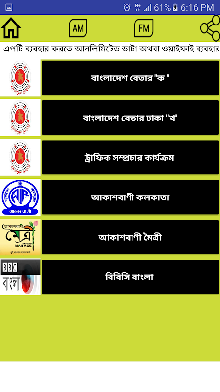 চ্যানেলগুলো শুনতে WiFi অথবা Mobile Data চালু রাখতে হবে।