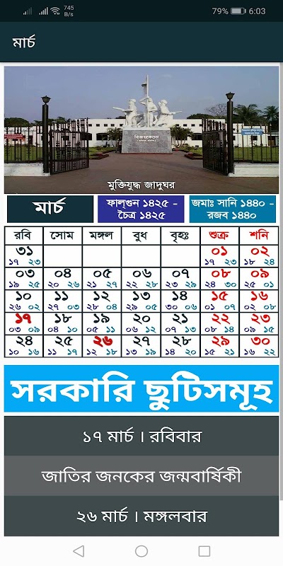 This calendar contains the date of 2019 with government holiday of Bangladesh. It also contain bengali calendar 1425 to bengali calendar 1426 and arabic calendar 1440 to arabic calendar 1441. All this calendar is made for Bangladesh. Only Bangladeshi people should be install this app.