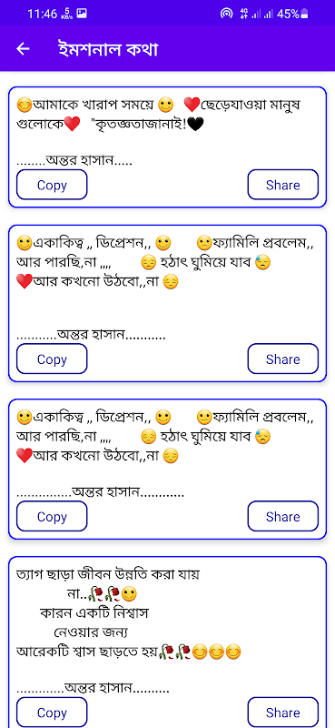 এটি বাংলা এসএমএস 2023 অ্যাপ্লিকেশন। তাই অবশ্যই উপভোগ করবেন। বাংলা এসএমএস বক্স আপনাকে আপনার প্রিয়জনকে বাংলা এসএমএস পাঠাতে সাহায্য করবে।