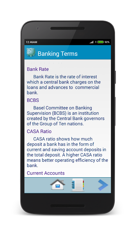Different Topics covered in this app are: Indian Financial System, Indian Banking System, Reserve Bank of India, Monitory policy of India, Fund Transfer, Bank Cards, Core Banking, solution, Banking Terms, Taglines of Banks, Bank Headquarters, Bharatiya Mahila bank, Industrial development bank, Industrial finance corporation, National Housing Bank, Regional Rural Banks, State Bank of India, Small industries development bank of India, Finance Commission of India, Banking Abbreviations, Awards and Related Fiels, Static GK: World Countries,capital and currency, Static Gk: Important Days, River side cities, State Capital, State Dance forms, National Parks, State Chief Ministers, State Governors, Cabinet Ministers