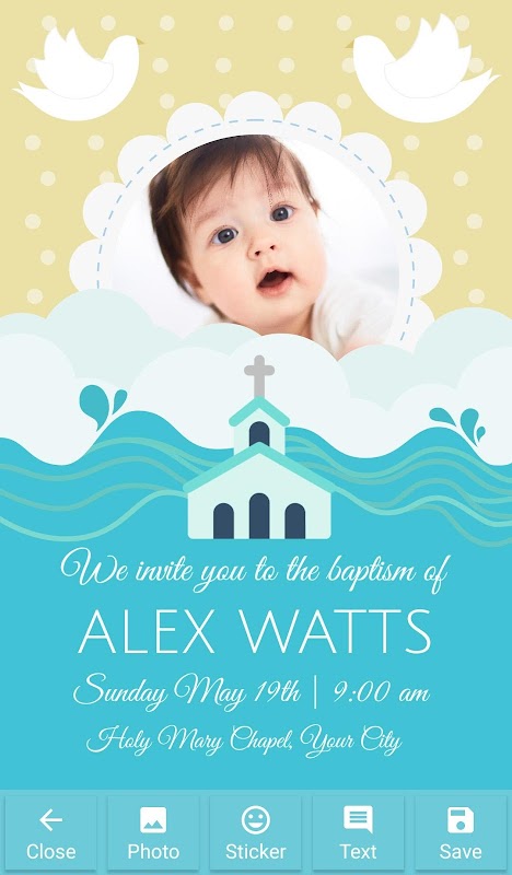 Personalize with Photos: Customize your baptism invitations and baptism cards by adding a photo from your gallery or device camera.