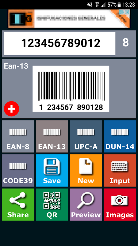 Create bar code labels in seconds. Also it allows yourself to verify if the digit control of the Ean8 or Ean13 is correct. For codes Ean8, introduce 7 digits and press the button Ean-8, for codes Ean13, introduce 12 digits and press the button Ean-13, also is possible to create codes of 12 numbers (12345678901 will be 123456789012), in all the cases the application will take charge generating the digit control and drawing the bar code, for generic codes use the button Code-39. The label can be saved in the SD card pressing the button Save as.png Label. Use the button NEW to create a new label.