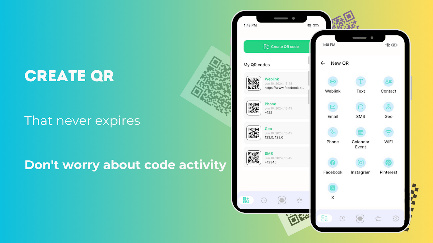 The QR Code Generator lets you generate QR Code for weblinks, custom text, contacts, email, events, Wi-Fi, and social media, which will never expire.