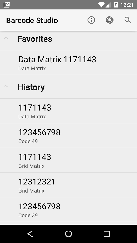 To enable quick access to often used barcodes, you can add a generated barcode to your list of favorites. A history list shows all the barcodes you have generated in the past. These two features can be unlocked with an in-app purchase.