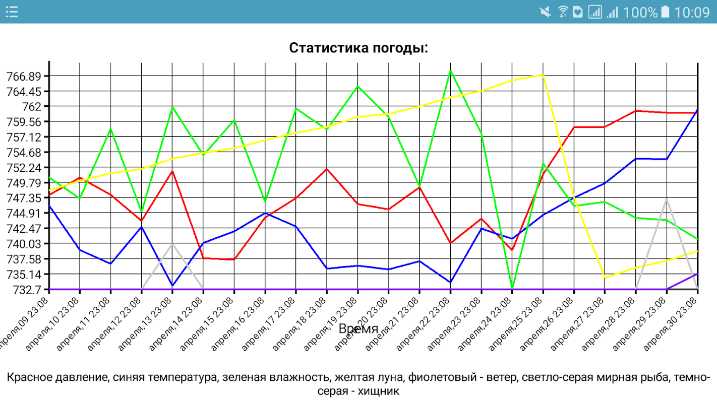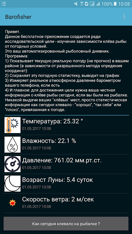 Данное бесплатное приложение создается ради исследовательской цели - изучение зависимости клёва рыбы от погодных условий.
