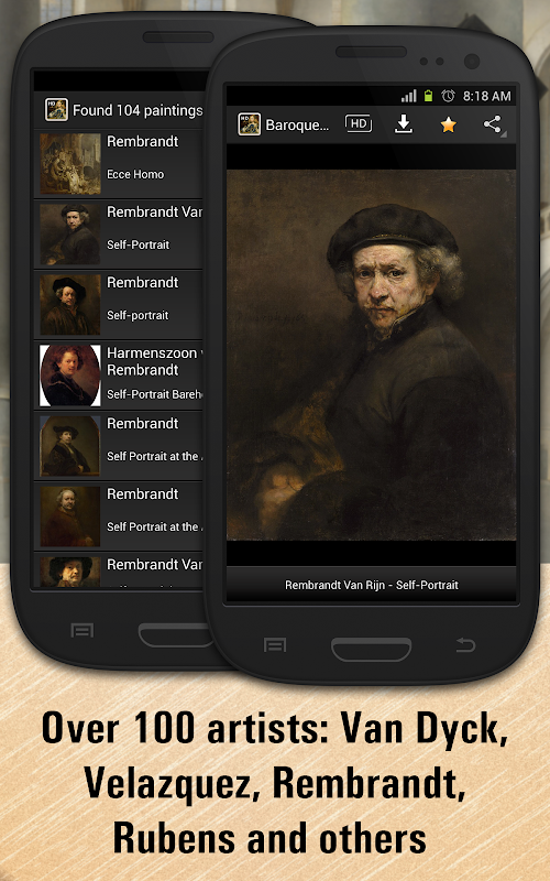 The application contains a great collection of 1149 paintings of 100 different artists - including Michelangelo Merisi da Caravaggio, Peter Paul Rubens, Anthony van Dyck, Rembrandt van Rijn and many others.