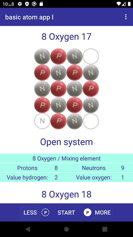 The app shows the checkerboard-like atomic structure using protons and neutrons