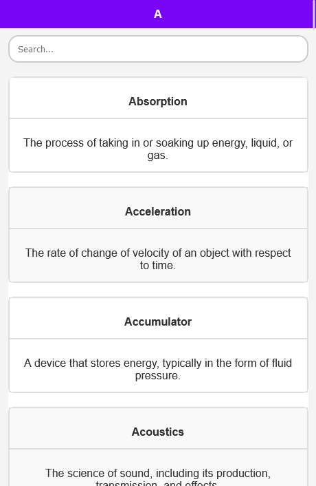 Extensive Collection: Our basic engineering dictionary app includes a vast collection of engineering terms from various disciplines, including civil, mechanical, electrical, and more. Each term is clearly defined to help you understand complex concepts with ease.
