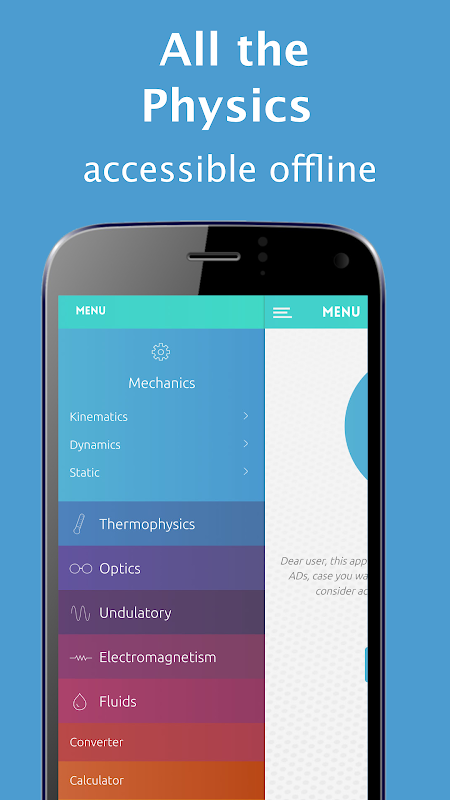 All contents of classical physics: mechanical, thermophysical, optical, wave, electromagnetism, and fluids. Also, a calculator, to help the student solve exercises and a unit converter. There are also interactive animations.
