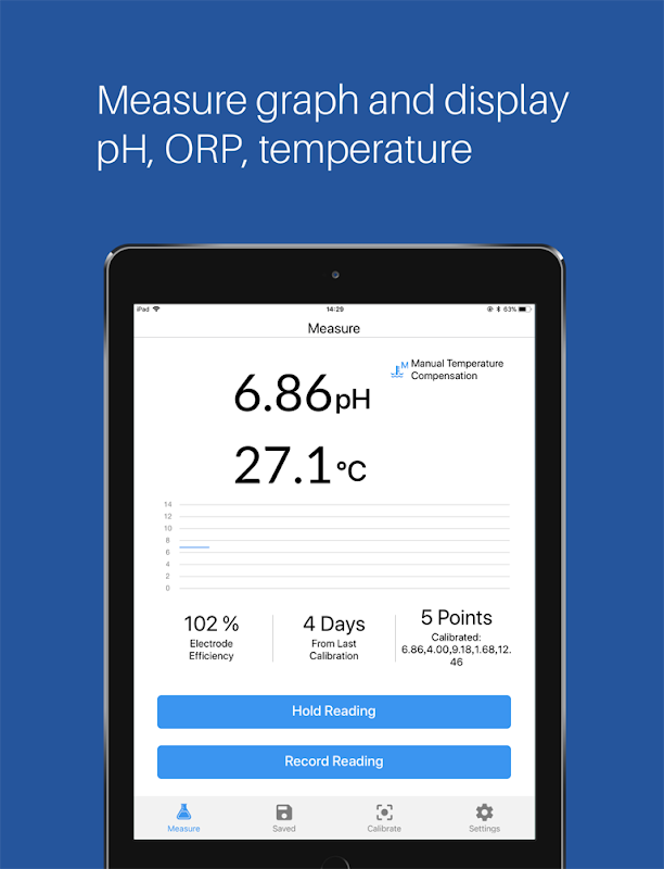 Display pH and ORP with temperature readings simultaneously with electrode efficiency, last calibration date and real-time graphing.