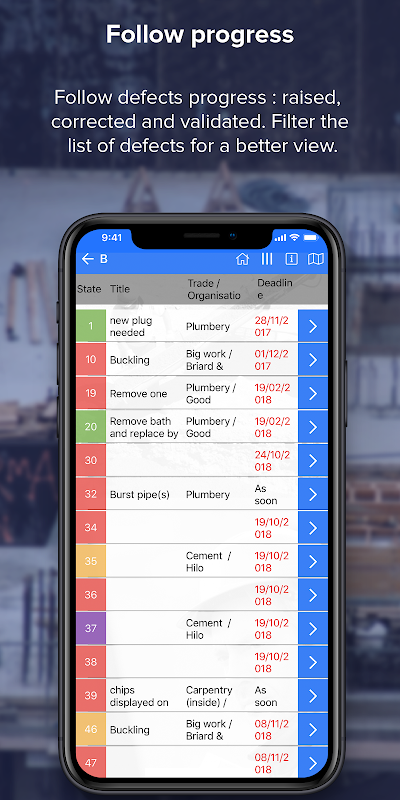 => Create, manage and correct your defect on site. On mobile or tablet, the application replaces the use of spreadsheets or paper.