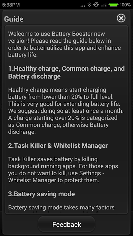 Battery Booster saves battery by killing running background processes. For apps that you do not want to kill, you can use Whitelist Manager to protect. Furthermore, with the advanced task manager (Memory Booster - Android RAM Optimizer), Battery Booster can perform better and help you get the best battery saving results!