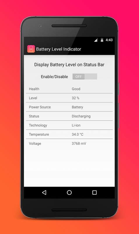 Simple app to show Battery Level indicator on status bar and Battery Information