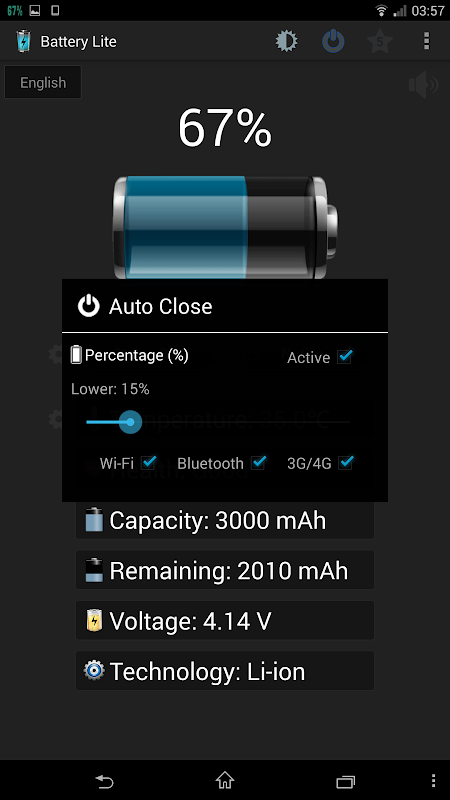 The auto close function close the Wi-Fi, Bluetooth or the Data (3G/4G), if the percentage of battery is low. (Manual selection: 90% - 2%)