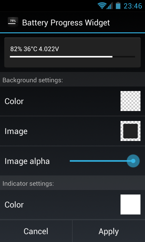 The widget shows battery percentage bar (like a progress bar) and can also show a text containing the battery percentage, temperature and voltage.