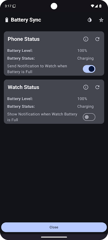 This application can be used to sync your phone battery to your Wear OS watch allowing you to view it at a glance, and it also allows you to enable notifications on your phone/watch when the companion app's device has finished charging (i.e. receive a watch notification when your phone has reached 100%).