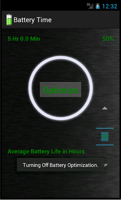 Save Battery Life on your Android. Simply click the "Optimize" circle of power and your Android battery will achieve max battery potential. This app also displays the time remaining on your battery in the top left corner. The top right corner contains the percentage of charge remaining on your battery. Select your average battery life in hours for your device from the picker to achieve best results. "Optimize" mode will turn off wifi and bluetooth as well as adjust screen brightness to maximize device battery. Great for idle times at work, while sleeping, on an airplane, or any occasion when battery life needs to be maximized.