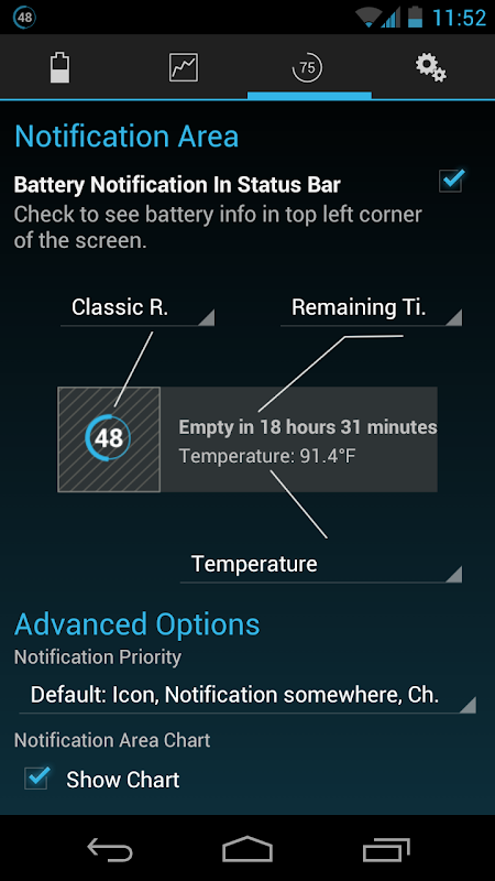 - customisable texts in notification area (estimated time left, voltage, temperature, battery health)