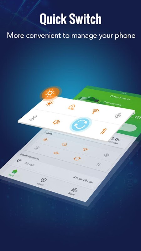 There are four smart save modes for you, choose the most suitable mode according to your requirement. Never worry about consuming too much power anymore. Choose Default Mode, keep current phone settings; General Mode, lower brightness of your phone, keep Bluetooth and GPS off; Strict Mode, only call and message functions are allowed; Extreme Mode, equal to airplane mode. When your phone is in low power or needs to get charged, you can switch to a suitable mode to save battery power. Battery(Battery Saver Tool)let your power extender dream come true.