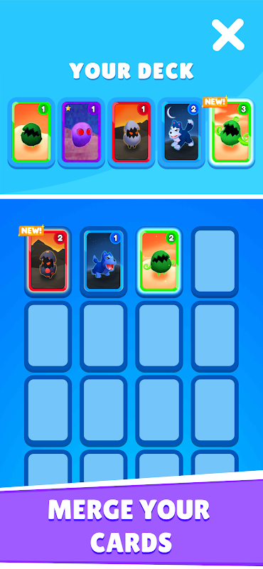 Merge cards to evolve your monsters and beat opponents to gain more cards!