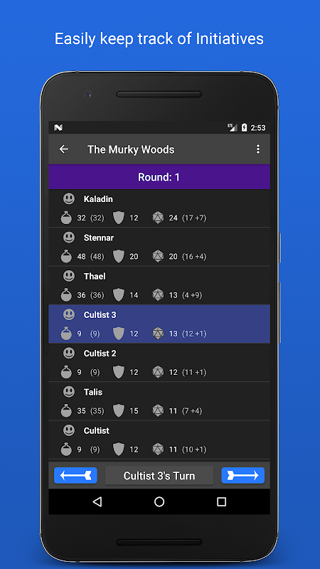 Players, monsters and NPCs are all ordered according to their initiative rolls (conflicts are resolved with the higher modifier going first). The name of who's turn it is currently is shown and turns can be advanced or reversed using the buttons at the bottom. For interactions tap on the effected player, monster or NPC in the list and enter the type and amount.