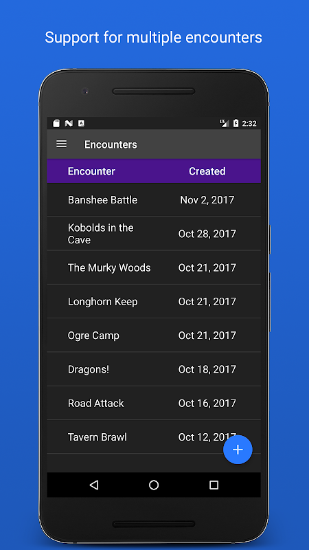 BattleTrack makes it simple to create, manage and track multiple encounters for your game sessions. BattleTrack is compatible with D&D (Dungeons & Dragons) and many other D20 based games that use an initiative based system. BattleTrack makes starting and running encounters easy freeing up time to enjoy the action.