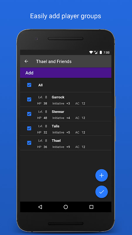 Encounter creation is easy. Just tap the "+" button and choose whether you want to add players or Monsters and NPCs. For players tap the all check box or add individual players by tapping the check boxes next to them. For monsters and NPCs just tap the "+" or "−" buttons to change the quantity of the monster or NPC you would like to add. Search the list by tapping the magnifying glass icon in the top right.