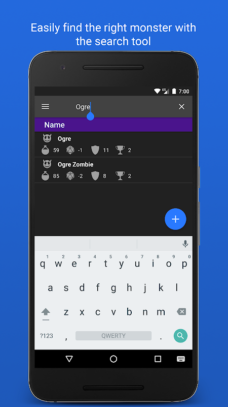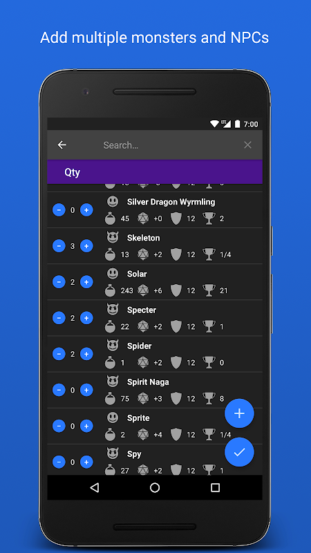 • Easily find and add multiple monsters and NPCs using the searchable list. Includes a large list of monsters from the D&D Systems Reference Document (SRD) to get you started with support for adding more.