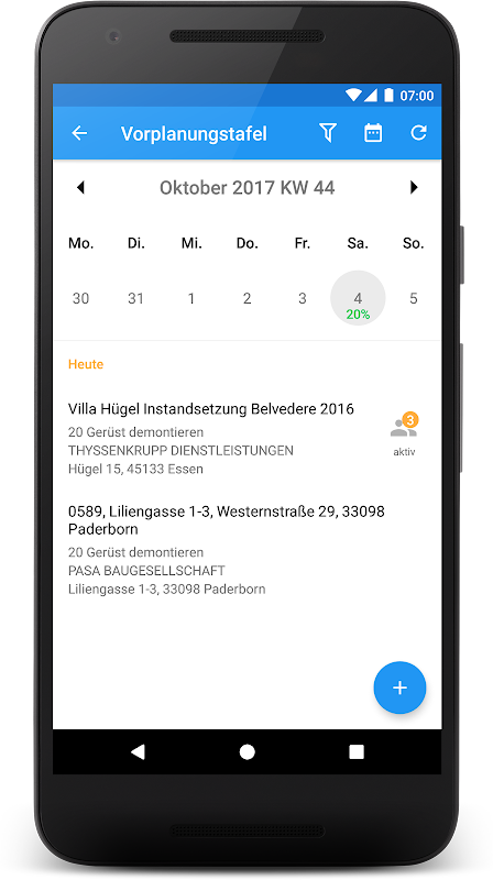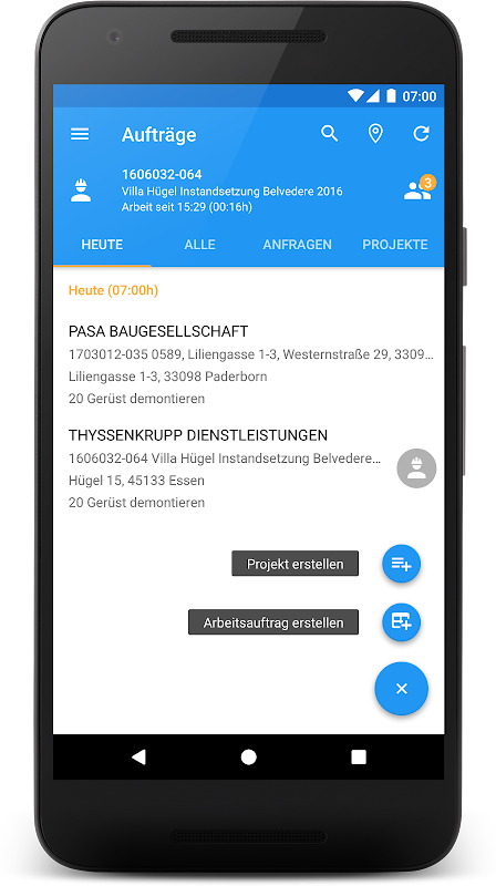 Working orders are assigned to respective projects. This is basically used for time-tracking and documentation. A daily disposition and even pre-planning of the convoy is possible, just like deposit the risk assessment.