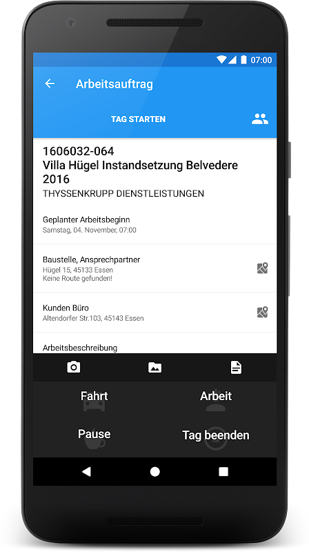 - Project registration with site address, working time and pictures (e.g. drawings, special instructions)
