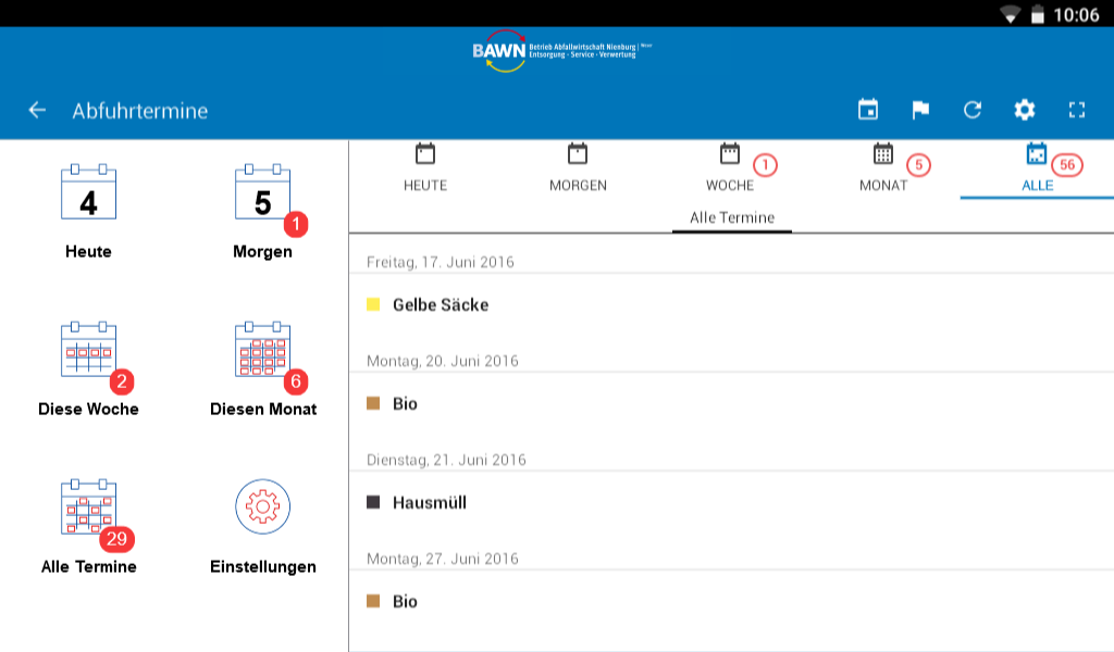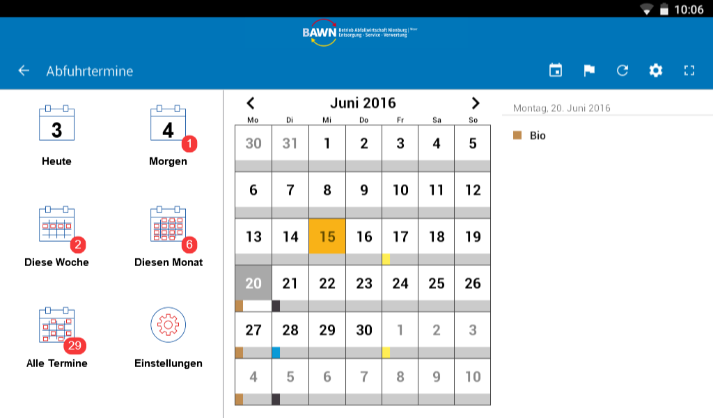 Residual waste, paper, organic waste, recyclable - when what is collected? Free, accurate and fast, the app of the waste management company Nienburg / Weser (Bawn) response. And not only that: Who uses the memory function is informed this to the removal dates. In addition, the Bawn App informs continuously about the current service performance and provides answers to many other questions about the waste in Nienburg / Weser district.