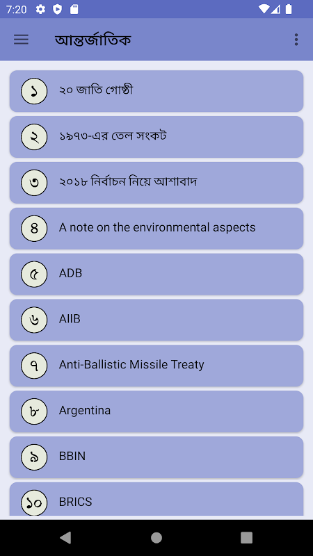 আগামীতে যারা বিসিএস প্রিলিমিনারি বা ৩৮ তম বিসিএস সিলেবাস পরীক্ষায় অংশগ্রহন করবেন তাদের জন্য উপযোগী এর সকল কিছু এখানে পাচ্ছেন। বিসিএস প্রিলি পাশ করার পরই বিসিএস লিখিত প্রশ্ন বা পরীক্ষার প্রস্তুতি শুরু করে দিতে হবে। কারন বিসিএস প্রিলি এর পর খুব কম সময় থাকে লিখিত পরীক্ষার। বিসি এস পরীক্ষায় সাধারন জ্ঞান বিষয়াবলী মধ্যে ২টি ভাগে বিভক্ত একটি হচ্ছে বিসিএস বাংলাদেশ বিষয়াবলী আর অপরটি হচ্ছে বিসিএস আন্তর্জাতিক বিষয়াবলী। আমাদের এই অ্যাপটি আন্তর্জাতিক এর সকল বিষয় নিয়ে সাজানো হয়েছে।