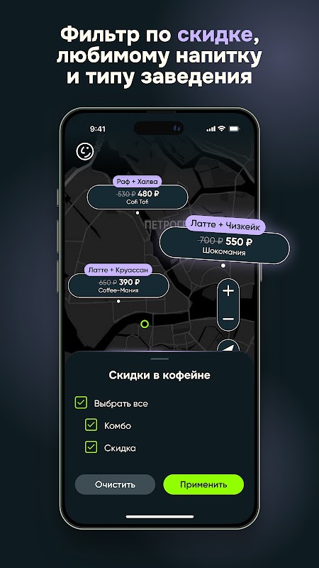 ✅ For convenient filters for choosing establishments where: your favorite drink is available, great discounts and combos apply, you can drink and eat, make a drink in a coffee machine, perk up while driving, order delivery to your home or office. Where there is not only coffee, but also delicious: tea, smoothies, bubble tea, matcha, other soft drinks.
