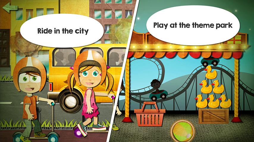 This fun educational app offers a whole host of scenarios for creative pretend play. Play house in the bedroom and the back yard, pick and match food at the grocery store, swing and slide at the playground. Kids will love to swim and play ball at the beach, control the traffic in the city, pick apples from the apple tree, win prizes at the theme park and so much more!