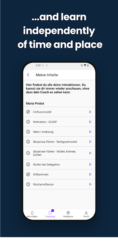 The BeCoach app offers you the possibility to connect with your coach, trainer or another consulting person so that they can assist you in your individual process. This person can support you via chat or with learning units, exercises and other formats in the app and help you to achieve your personal learning success.