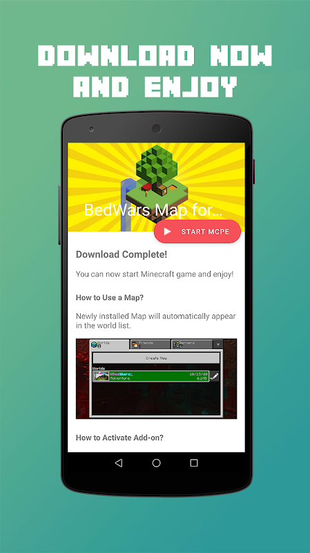 BedWars Map for MCPE is an application that allowed you to download and install a fully functional Bedwars map for Minecraft Pocket Edition in just few easy step! With our 1-Click installer, you can easily get Minecraft Maps, Addons, Mods, Skins, and Texture Packs to your smartphone or tablet in only 1 single tap!