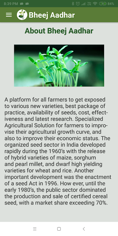 A platform for all farmers to get exposed to various new varieties, best package of practice, availability of seeds, cost, effectiveness and latest research. Specialized Agricultural Solution for farmers to improvise their agricultural growth curve, and also to improve their economic status.