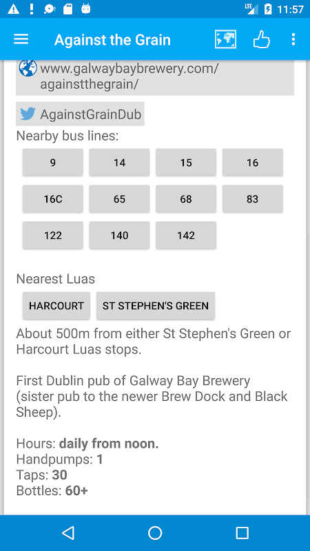 Each entry contains a review, photograph, nearest bus lines, contact info, website and twitter handle for each pub. Check the pub's twitter feed for news without leaving the app. A map will show the location of the pub as well as nearby listed pubs.