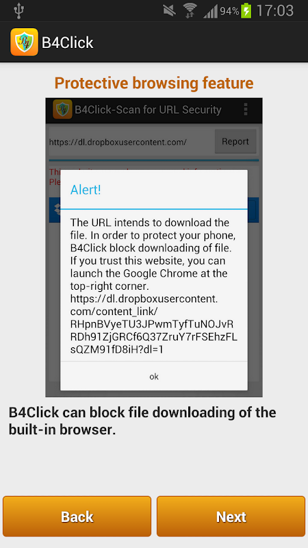 ✔ With its protective browsing feature, B4Click can block file downloading of the built-in browser. This feature is very useful when you occasionally surf malicious websites that force an app download without your consent.