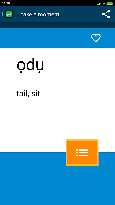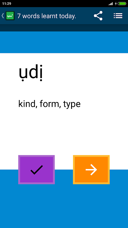 Pace yourself as you go through the almost a thousand common and popular Igbo words available in the app. In just a matter of weeks, you will have an essential knowledge of the Igbo vocabulary !