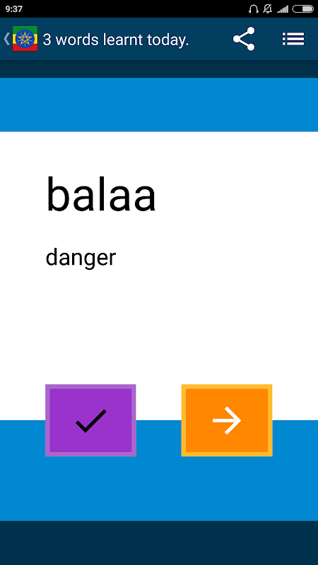 Pace yourself as you go through the almost a thousand common and popular Oromo words available in the app. In just a matter of weeks, you will have an essential knowledge of the Oromo vocabulary !