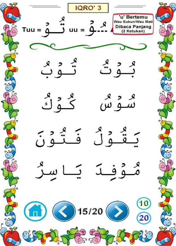 - Iqro' 3: Learn to read kasroh ('i'), dhommah ('u'), long readings, and their variations.