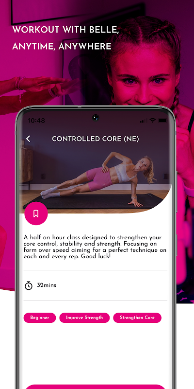 You can either join a brand new workout with Belle on the live stream every morning from wherever you are or choose from a huge library of on demand workouts (saved live workouts) ranging from HIIT, Sculpt and Cardio to Mobility and Pilates.