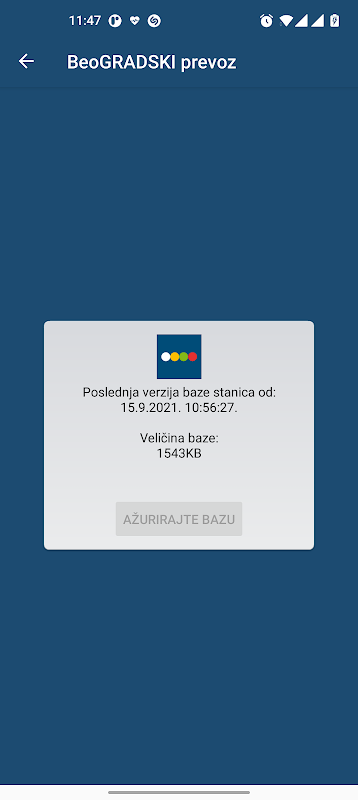 • omogućeno manuelno ažuriranje baze stajališta preko sistemskog menija, pri čemu se prikazuje poslednja ažurirana verzija baze stajališta i njena veličina, uz obaveštenje o novoj verziji, za čije ažuriranje je neophodan pristanak korisnika zbog prenosa podataka;